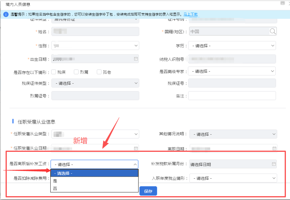3. 找到【是否离职后补发工资】,按需选择+填写补发月份