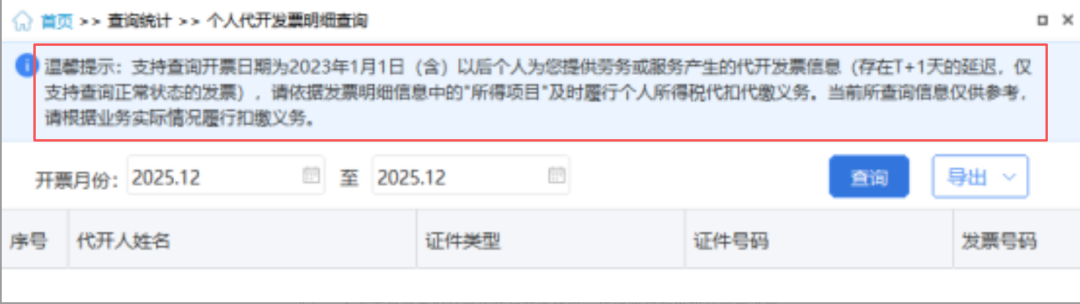 企业可查询 2023 年 1 月 1 日之后,个人为企业代开发票的全部详细信息,其中【所得项目】一栏会直接明确企业是否需要代扣代缴个人所得税,以及具体的代扣代缴履行要求。